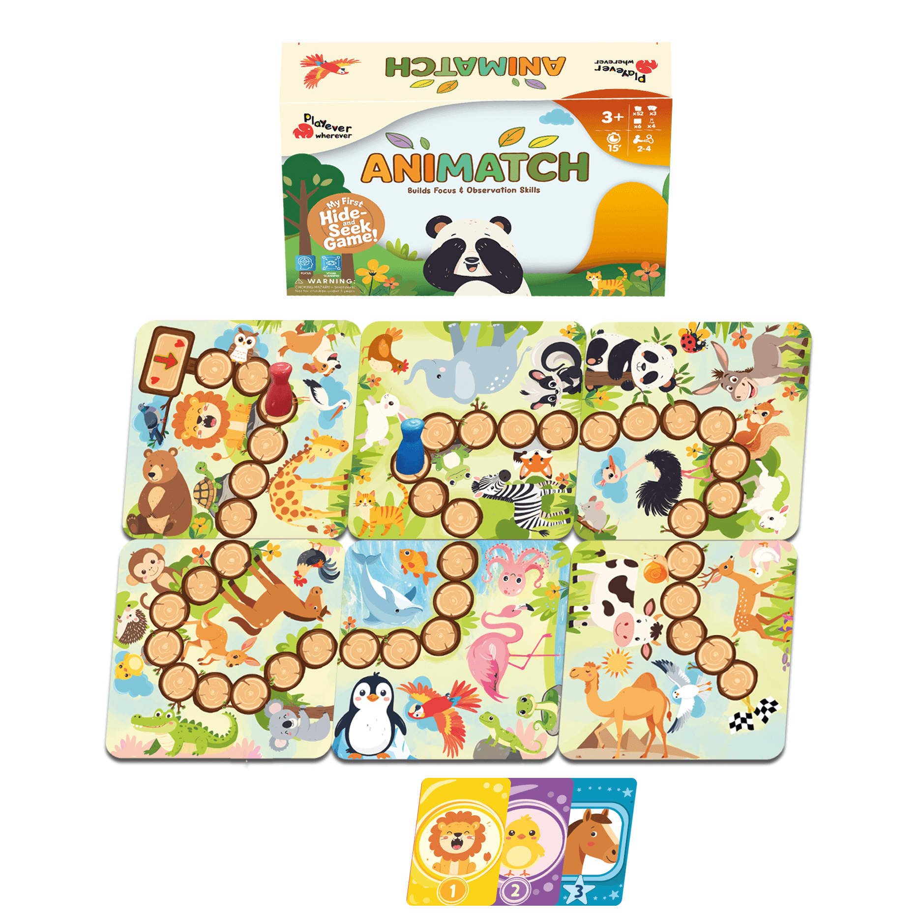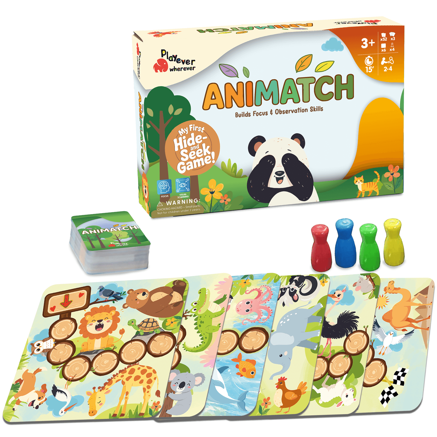 PLAYEVER ile Her Oyunda Gelişim Var! Playever ANIMATCH, hayvan temalı eğlenceli bir çocuk kutu oyunu ve tüm aile için heyecan dolu bir dikkat ve görsel algı oyunudur. Ormanda oynanan büyük bir saklambaç başlıyor! Kart açılır, gözler yarışır… Kazanan yalnızca hayvanları en hızlı bulan değil, en çok eğlenen olacak! Kazanımlar; görsel algı ve dikkat, eşleştirme, kısa süreli hafıza gelişimi.