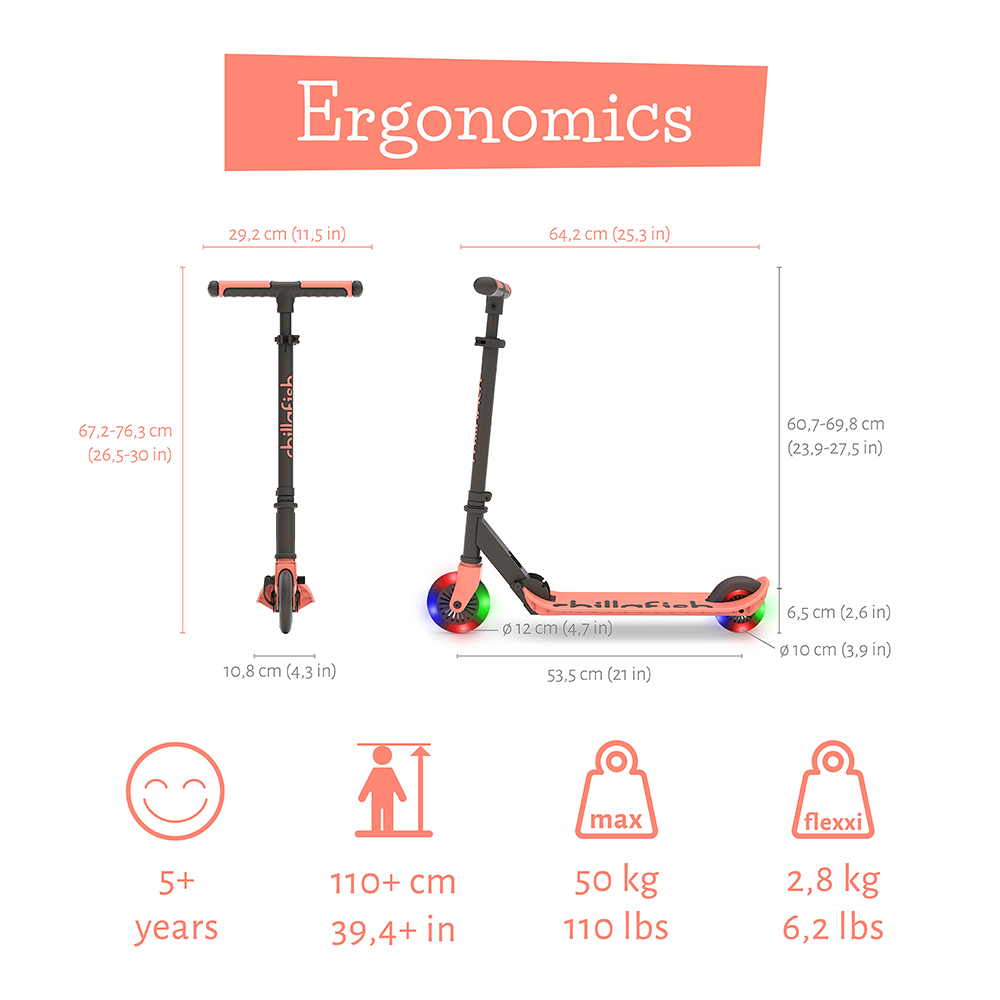 Flexxi, Chillafish scooter ailesinin 2 tekerlekli, kompakt, hafif, katlanır yeni scooter serisi! Şimdi pil gerektirmeyen led ışıklı tekerlekleriyle daha da havalı. Hafif alüminyum alaşım bu scooter entegre kolay katlama sistemiyle, PU yüksek kaliteli tekerlekleriyle, güvenlik ve iyi kavrama için Chillafish imzalı Twintip güçlü plastik hafif kavisli ayak tablasıyla ve entegre ayak freniyle harika bir scooter. 3 kademeli ayarlı direksiyonu ile 5 yaş ve 100 cm üzeri, 50 kg altı çocuklar için uygundur. Çocukların motor, denge, koordinasyon ve sürüş becerilerini geliştirir.