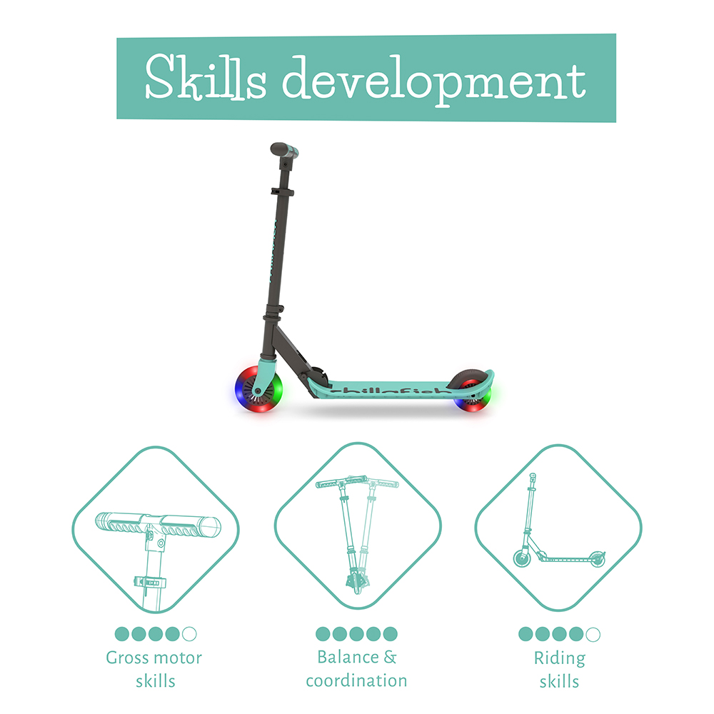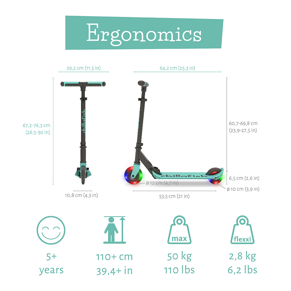 Flexxi, Chillafish scooter ailesinin 2 tekerlekli, kompakt, hafif, katlanır yeni scooter serisi! Şimdi pil gerektirmeyen led ışıklı tekerlekleriyle daha da havalı. Hafif alüminyum alaşım bu scooter entegre kolay katlama sistemiyle, PU yüksek kaliteli tekerlekleriyle, güvenlik ve iyi kavrama için Chillafish imzalı Twintip güçlü plastik hafif kavisli ayak tablasıyla ve entegre ayak freniyle harika bir scooter. 3 kademeli ayarlı direksiyonu ile 5 yaş ve 100 cm üzeri, 50 kg altı çocuklar için uygundur. Çocukların motor, denge, koordinasyon ve sürüş becerilerini geliştirir.