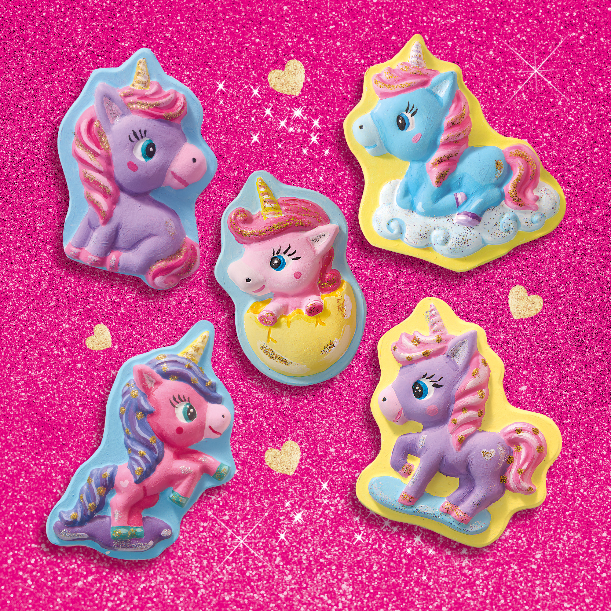 Kalıba Dök ve Boya un - Bebek Unicornlar ile yaratıcılığınızı konuşturun! Alçıdan 10 adet sevimli bebek unicorn figürü dökün ve 6 renk opak poster boyası ile tamamen kendi tasarımınıza göre boyayın. Yumuşak pastel tonlar için renkleri karıştırın veya parlak ve cesur renkleri tercih edin - seçim sizin! Altın ve gümüş parlak simleri kullanarak figürleri gerçekten ışıltılı hale getirin. El işleri, boyama ve unicornları seven çocuklar ve yetişkinler için mükemmel! un - Bebek Unicornlar