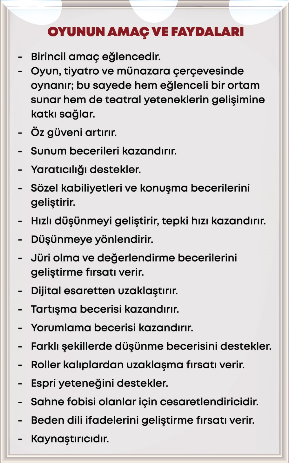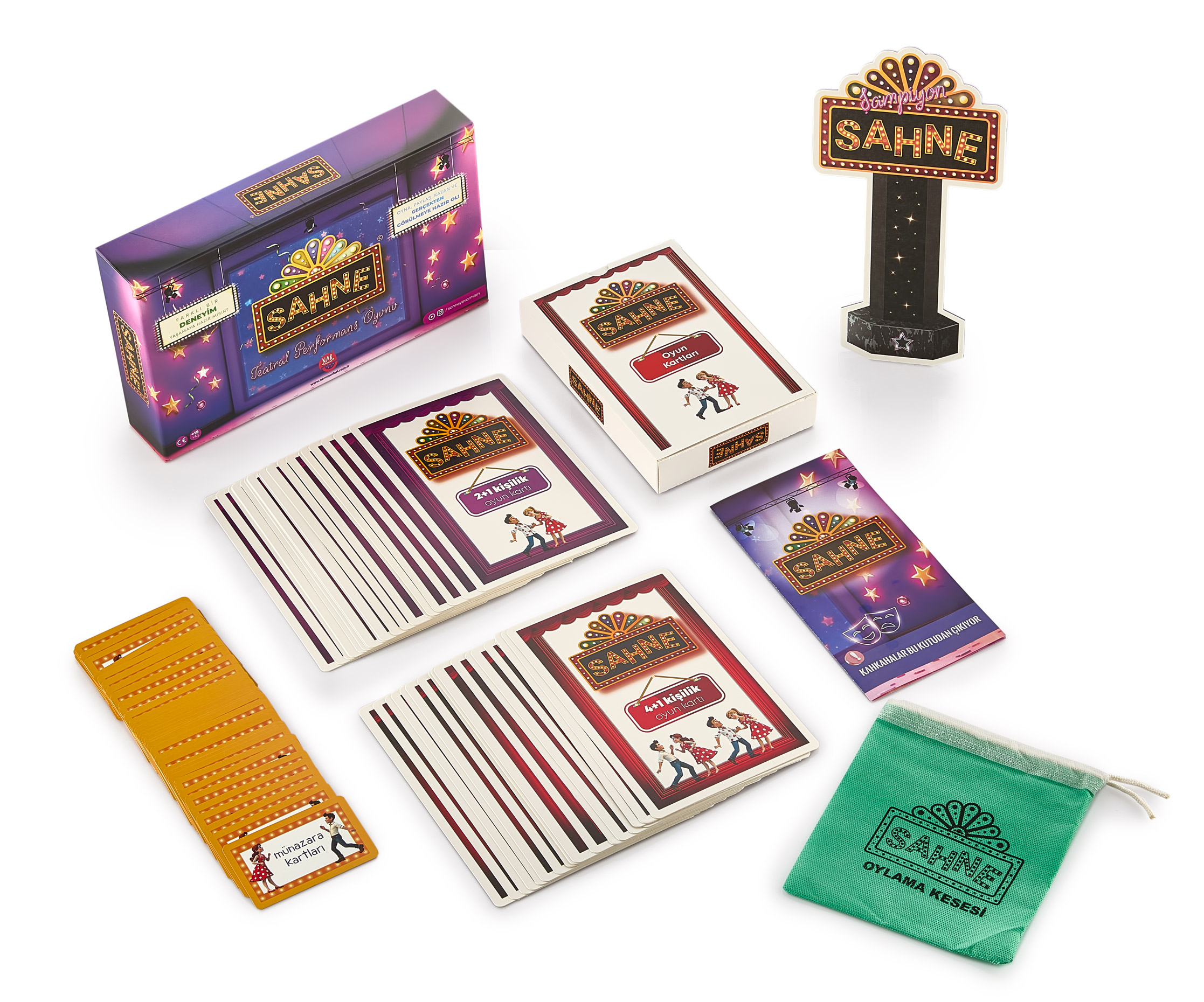 Sahne ışıklarına hazır mısınız? Gösteri dünyasına adım atmanın tam zamanı! 2 aşamadan oluşan bu oyun çok eğlenceli ve çok yaratıcı. İlk aşamada öncelikle 2 veya 4 kişilik takımlar oluşturulur ve her takım oyuncu sayısına göre rastgele bir sahne kartı seçer. Her takım kendi sahne kartında belirtilen vakayı ve karakterleri doğaçlama yaparak canlandırırken diğer takımların oyuncuları jüri görevi yapacaklar ve takımdaki en iyi oyuncuyu oylayarak seçeceklerdir. Tüm takımlar sahnelerini canlandırdıktan ve her takımın en iyisi belirlendikten sonra en iyiler ikinci aşamaya geçerken diğer oyuncular jüri olarak oyuna devam edeceklerdir. İkinci aşamada ilk aşamanın galipleri arasında yapılacak münazaralar ile günün şampiyonu belirlenir. Bunun için kutu içerisinde verilen birbirinden ilginç konulardaki münazara kartları kullanılır. Kutu içeriğinde 2 kişilik ve 4 kişilik sahne kartları, münazara kartları, oylama kesesi ve şampiyonluk kupası bulunmaktadır. Oyun minimum 4 kişi için tasarlanmıştır, ancak 2 kişi de jüri olmadan sahne kartları ile sahne alıştırmaları veya münazara kartları ile münazara çalışmaları yapabilir. Eğlendirirken, teatral yetenekleri geliştirir, özgüveni arttırır, sunum becerileri kazandırır, yaratıcılığı destekler, sözel kabiliyetleri ve konuşma becerilerini geliştirir, hızlı düşünme ve tepki verme hızı kazandırır, düşünmeye yönlendirir, jüri olma ve değerlendirme becerilerini geliştirme fırsatı verir, dijital esaretten uzaklaştırır, tartışma, yorumlama, farklı düşünebilme farklı düşünceleree saygı duyma becerisi kazandırır, kalıplardan uzaklaşma fırsatı verir, espri yeteneğini destekler, sahne fobisi olanlar için cesaretlendiricidir, beden dili ifadelerini geliştirme fırsatı verir. Önerilen yaş : 15+