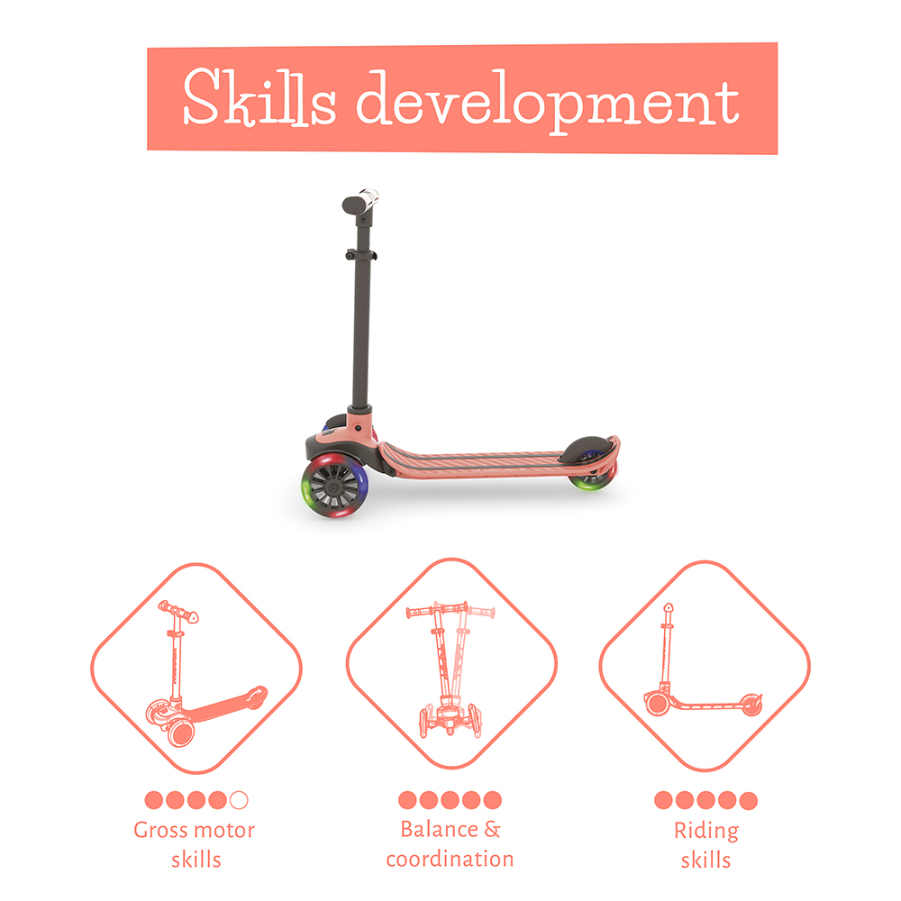 Scotti, klasik 3 tekerlekli scooter'ın Chillafish yorumudur! Şimdi pil gerektirmeyen led ışıklı tekerlekleriyle çok daha havalı. 3 yaş ve üzeri çocuklar için tasarlanmış bu hafif (2,4 kg), 3 tekerlekli scooter sağa sola eğerek yönledirilir. Bu şık scooter Twintip ayak tablası ve entegre ayak freni ile Chillafish imzası taşıyor. Yükseklik ayarlı direksiyon kolay taşınabilmesi için çıkarılabilir olarak tasarlanmıştır, süper rahat el tutacakları da konforlu bir sürüş deneyimi sunar. 3 yaş ve 80 cm üzeri, 50 kg altı çocuklar için uygundur. Çocukların motor, denge, koordinasyon ve sürüş becerilerini geliştirir.